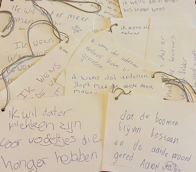 Kinderen uit Den Dolder hebben hun wensen op kaartjes geschreven. Ook deze hebben we aangeboden.Hun boodschap is helder. Mensen hebben bomen nodig, juist dichtbij. Voor volgende generaties is behoud van bossen van essentieel belang. Kappen betekent beduidend meer fijnstof en gezondheidsverlies, vooral voor onze kinderen en kleinkinderen